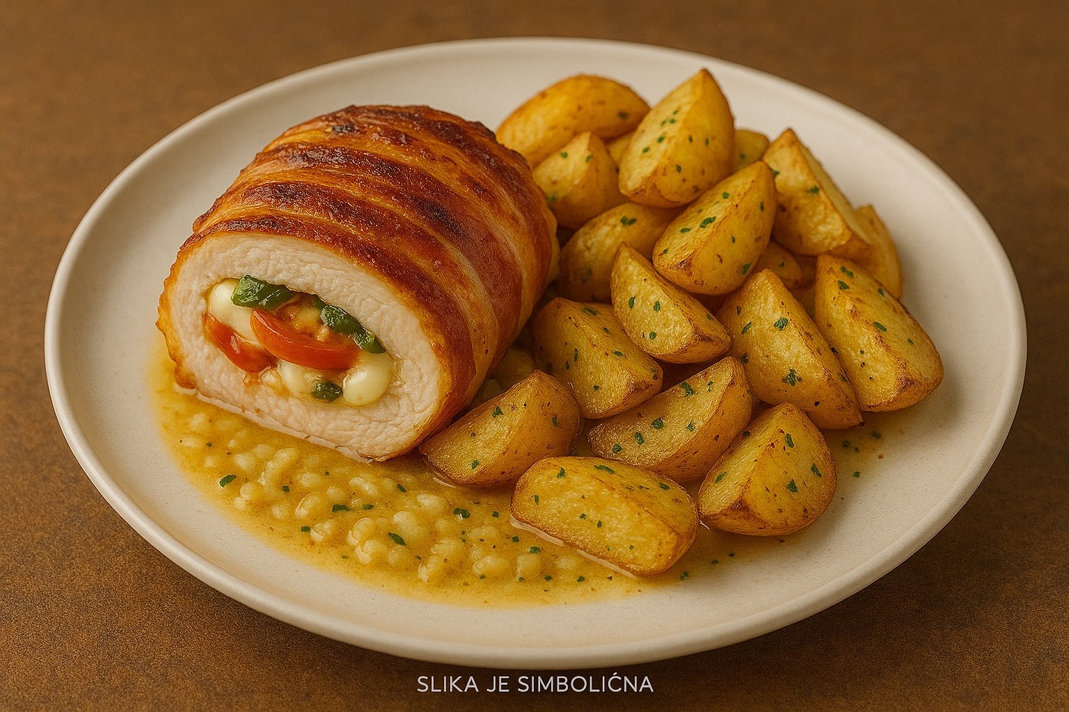 (piščančji zrezek, polnjen caprese, zavit v slanino, pečen krompirček)