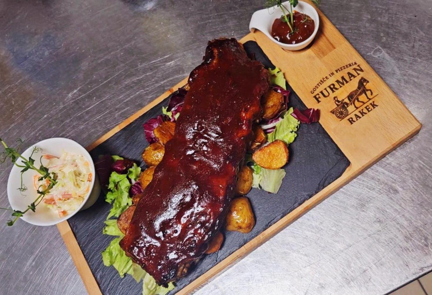 (rebrca, krompirček, ameriška solata, BBQ omaka)